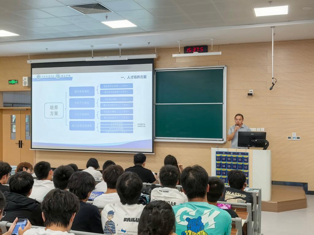 田登科首先为新生们详细解读了专业培养方案。他系统介绍了大学四年的课程体系架构,明确了各专业学生所需修读的总学时和学分要求,为同学们规划学业提供了清晰的路线图。接着,他重点讲解了学籍管理的重要规定和课程考核的相关规则,通过具体案例说明了学业警示、毕业条件等关键事项,提醒同学们务必遵守教学秩序,重视每一门课程的学习。