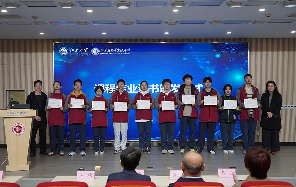 蒋志远首先致辞,他充分肯定了双方合作对于打破学段壁垒、贯通学生科学思维培养的重要意义,对本学期江南大学智能制造学院多名教师为南菁高中设计并开设四门新工科领域的校本课程表示感谢,并希望通过高校与高中的资源共享,为学生提供广阔的成长空间。智能制造学院副院长蒋毅进行课程总结报告,他表示课程有效激发了中学生的工程兴趣,初步培养了他们的项目实践与协作能力,成效良好。王冰与南菁高中刘辉副主任共同为顺利完成课程的学子颁发结业证书。