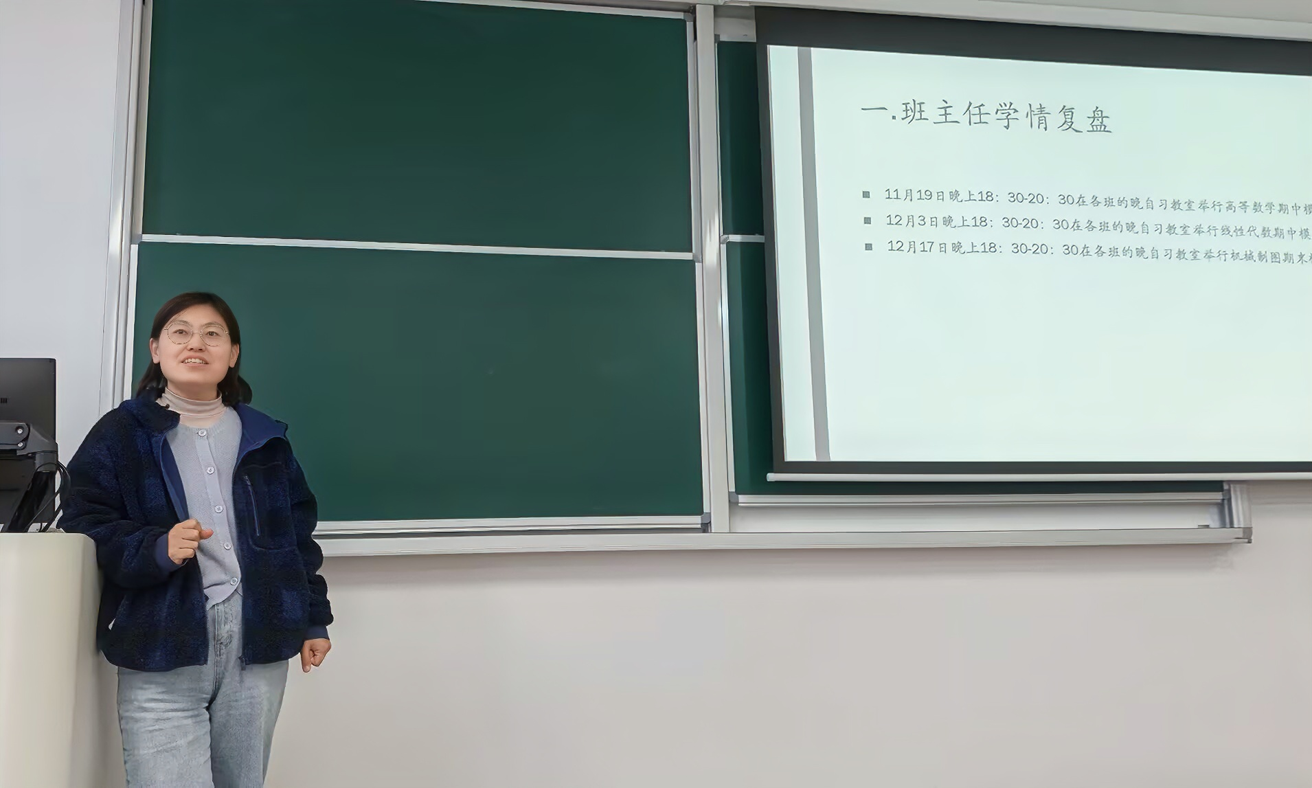 数据驱动,精准复盘学业表现。在本次各班班会的期中考试总结中,各班班主任通过展示两次考试的各分数段人数分布、专业内横向对比等关键数据,并结合辅导员提供的每月晚自习出勤情况做出了班级学习情况分析与指导:智造(创新班)2501班主任蒋毅老师通过对比关键数据,系统分析了班级整体表现,并对优秀、进步同学给予表扬,同时鼓励暂时落后的同学继续努力。机器人工程专业的班主任金光远老师和陈义文老师针对班级线性代数薄弱环节进行了重点解析,提出了具体学习建议。智能制造工程专业的班主任陈琛老师和李可老师则结合学业数据与自习出勤情况,引导同学关注学习习惯与学业表现的关联并通过多维度数据对比,深入剖析了班级存在的共性问题。